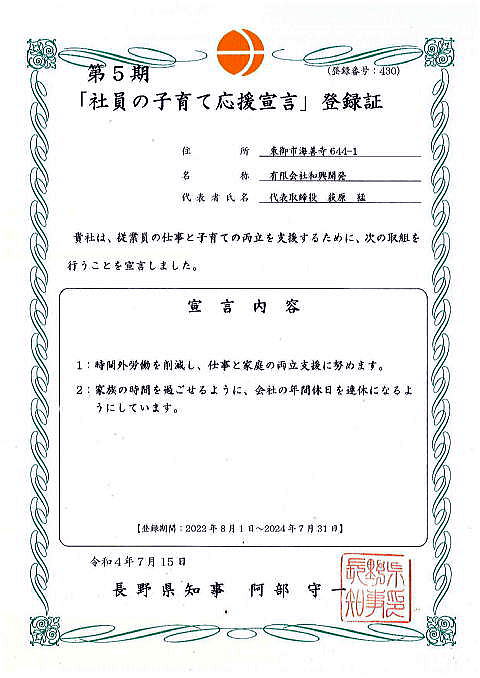 「社員の子育て応援宣言!」登録証